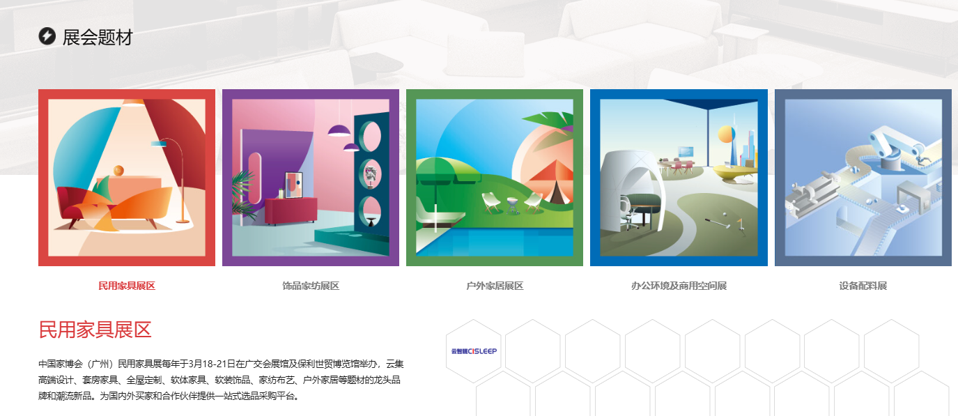 助力家具行业再度腾飞! 促进贸易成交及行业交流,为参展商和采购商缔造无限商机。享有"品牌第一阵营“亚洲家居交易中心“中国家具业的晴雨表”等行业美誉。