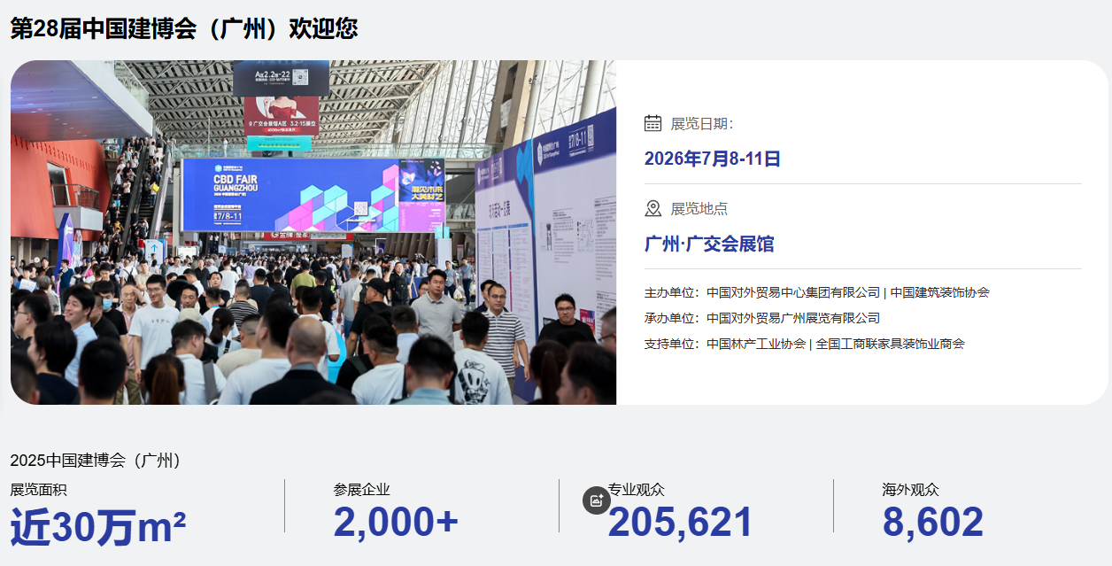中国(广州)国际建筑装饰博览会由中国对外贸易中心集团有限公司、中国建筑装饰协会主办,中国对外贸易广州展览有限公司承办,中国林产工业协会、全国工商联家具装饰业商会支持。作为大家居建装行业全球第一展,展会展览面积近30万平方米,参展企业超2000家,几乎囊括了中国大家居建装全产业链的头部品牌,吸引来自110多个国家和地区超20万名有商业价值的高质量专业观众到会。